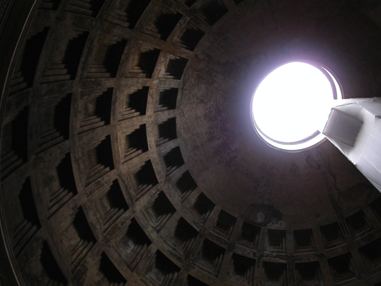 Many of the surrounding Roman antiquities are just ruins, but this building seems in perfect shape and is one of the oldest continuous use buildings in the world. The columns were are granite brought from Egypt. Behind the deep colonnaded porch, there is a cylindrical building 43 meters in diameter capped by a hemisphere the apex of which is 43 meters from its floor. If the dome were taken off and tipped upside down it would fit perfectly inside the cylindrical base. The only light enters by its only opening other than its doors, which is the oculus, a 2.3 meter open air circle in the center of the dome. Very few Roman buildings had an oculus and this is the largest known. The sun or moon light coming in this opening would circle the room showing the magnificence of the cosmos. There is some controversy about the building's purpose. It was probably built as a temple and yet it is very different than the usual Roman Temple such as the Roman Forum. Some say it was built to Mars and Venus. Its name suggests that it was built to "all the Gods". However, some ancient writers said that that word meant that the dome suggested the heavens where all Gods live. There was no dome as big until one in Florence was built in the 15th century.